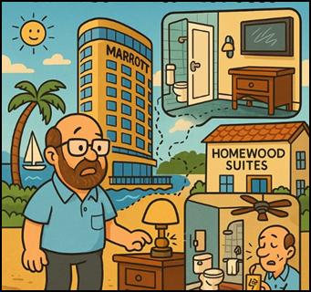 spray; and the living-room TV refused to function at all. By then, I was done calling the front desk. A quick inspection showed the hotel’s own